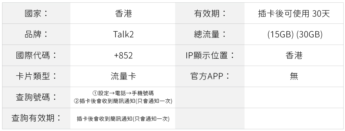 該卡特點:1. 香港地理位置IP顯示,就像在香港當地使用網路。2. 續費可長期使用,可自行儲值,到期前充值100港幣可延期1個月15G流量。3. 各種通訊、社交軟體註冊 (TELEGRAM(小飛機)、WhatsAPP、Apple ID、小紅書、TK、Viber等....)(不保證所有App都可以註冊成功,可能因電信公司政策、IP、地區等因素導致無法成功。